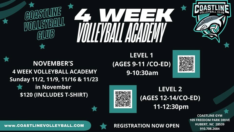 Coastline Volleyball Club is excited to serve Onslow County, Carteret County and other surrounding counties by offering competitive and developmental club volleyball programs for girls and boys in both indoor and beach volleyball. Coastline strives to help improve the overall level of youth volleyball in Eastern North Carolina by training and competing at the highest level in a fun, supportive, and competitive community-based environment. Coastline’s new private facility will be conveniently located near Jacksonville, Swansboro, Morehead City, Sneads Ferry & Havelock.