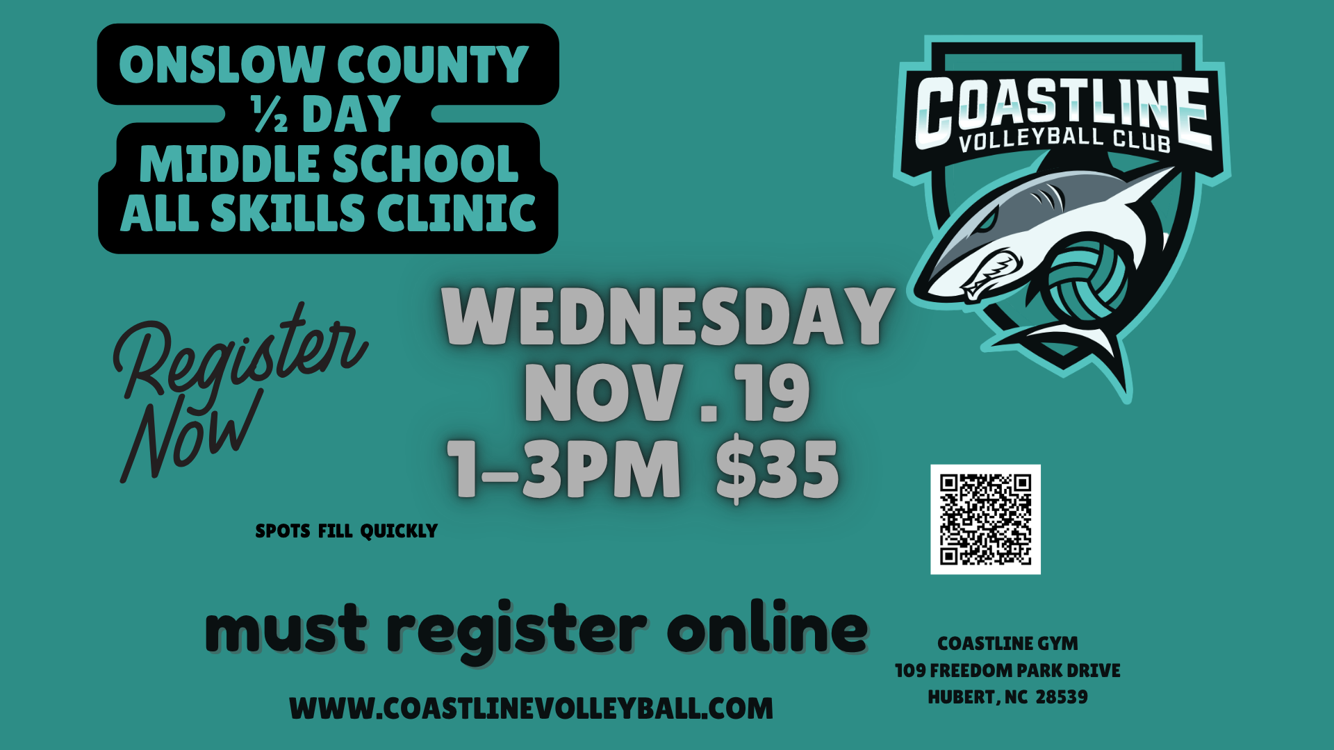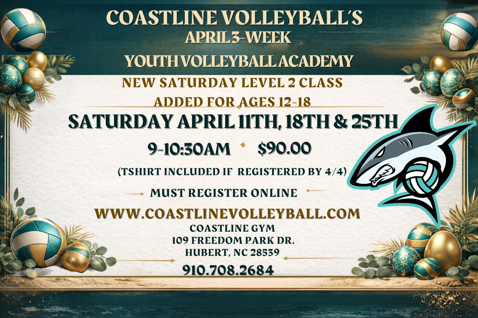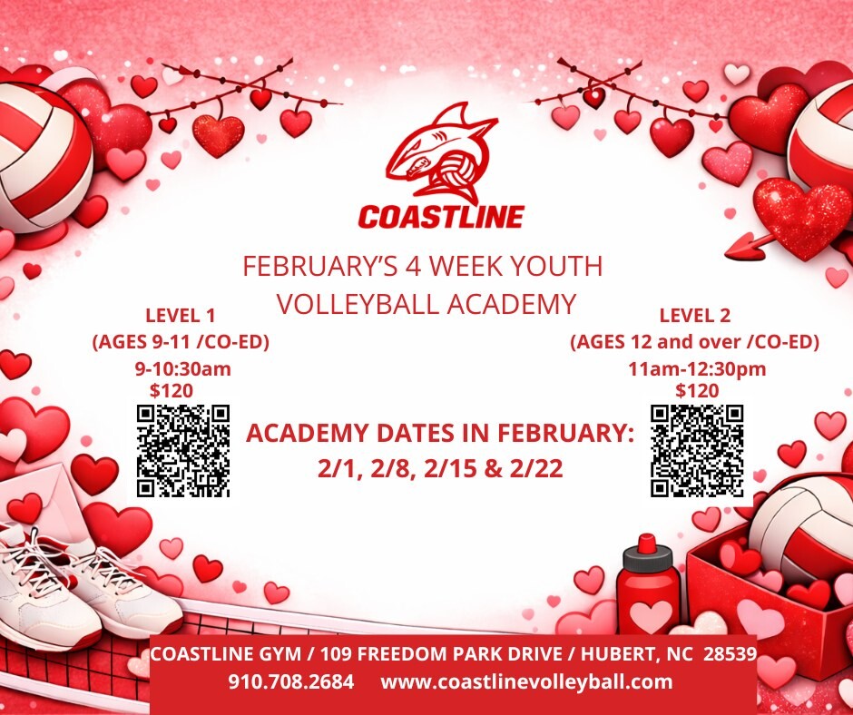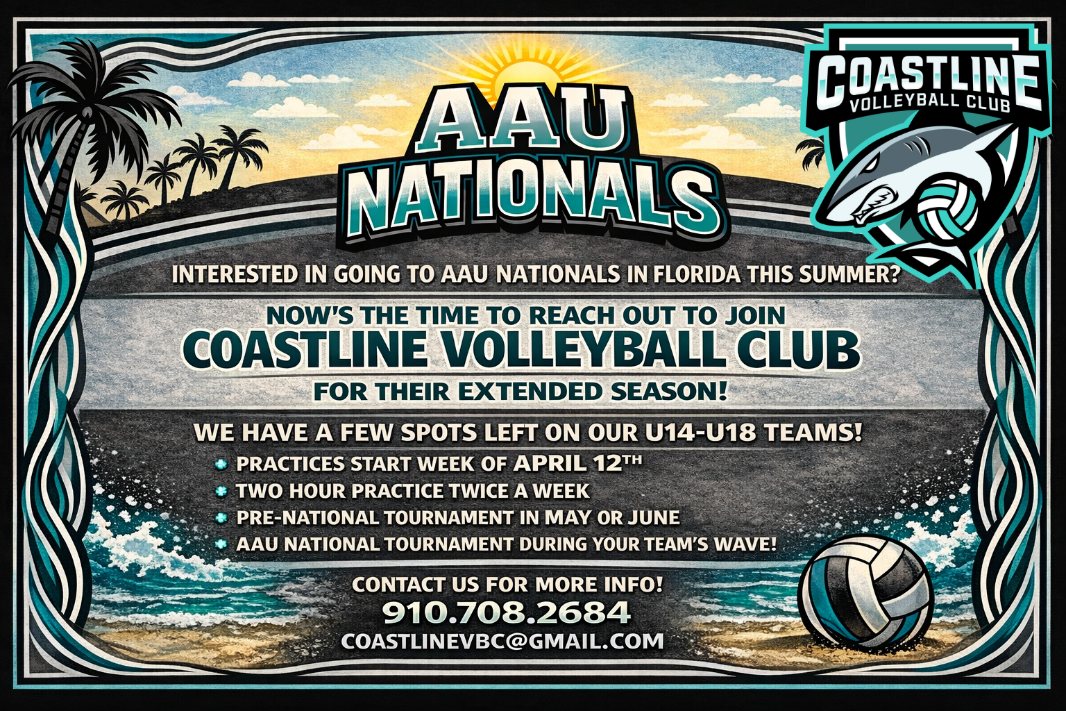 Coastline Volleyball Club is excited to serve Onslow County, Carteret County and other surrounding counties by offering competitive and developmental club volleyball programs for girls and boys in both indoor and beach volleyball. Coastline strives to help improve the overall level of youth volleyball in Eastern North Carolina by training and competing at the highest level in a fun, supportive, and competitive community-based environment. Coastline’s new private facility will be conveniently located near Jacksonville, Swansboro, Morehead City, Sneads Ferry & Havelock.