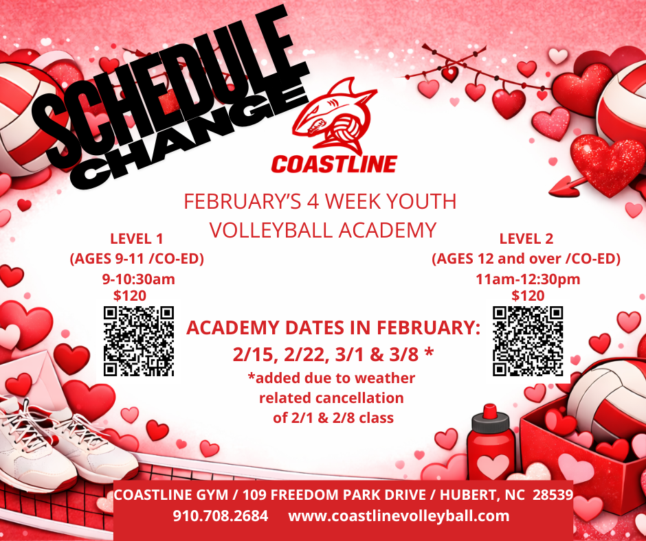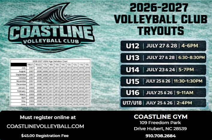 Coastline Volleyball Club is excited to serve Onslow County, Carteret County and other surrounding counties by offering competitive and developmental club volleyball programs for girls and boys in both indoor and beach volleyball. Coastline strives to help improve the overall level of youth volleyball in Eastern North Carolina by training and competing at the highest level in a fun, supportive, and competitive community-based environment. Coastline’s new private facility will be conveniently located near Jacksonville, Swansboro, Morehead City, Sneads Ferry & Havelock.